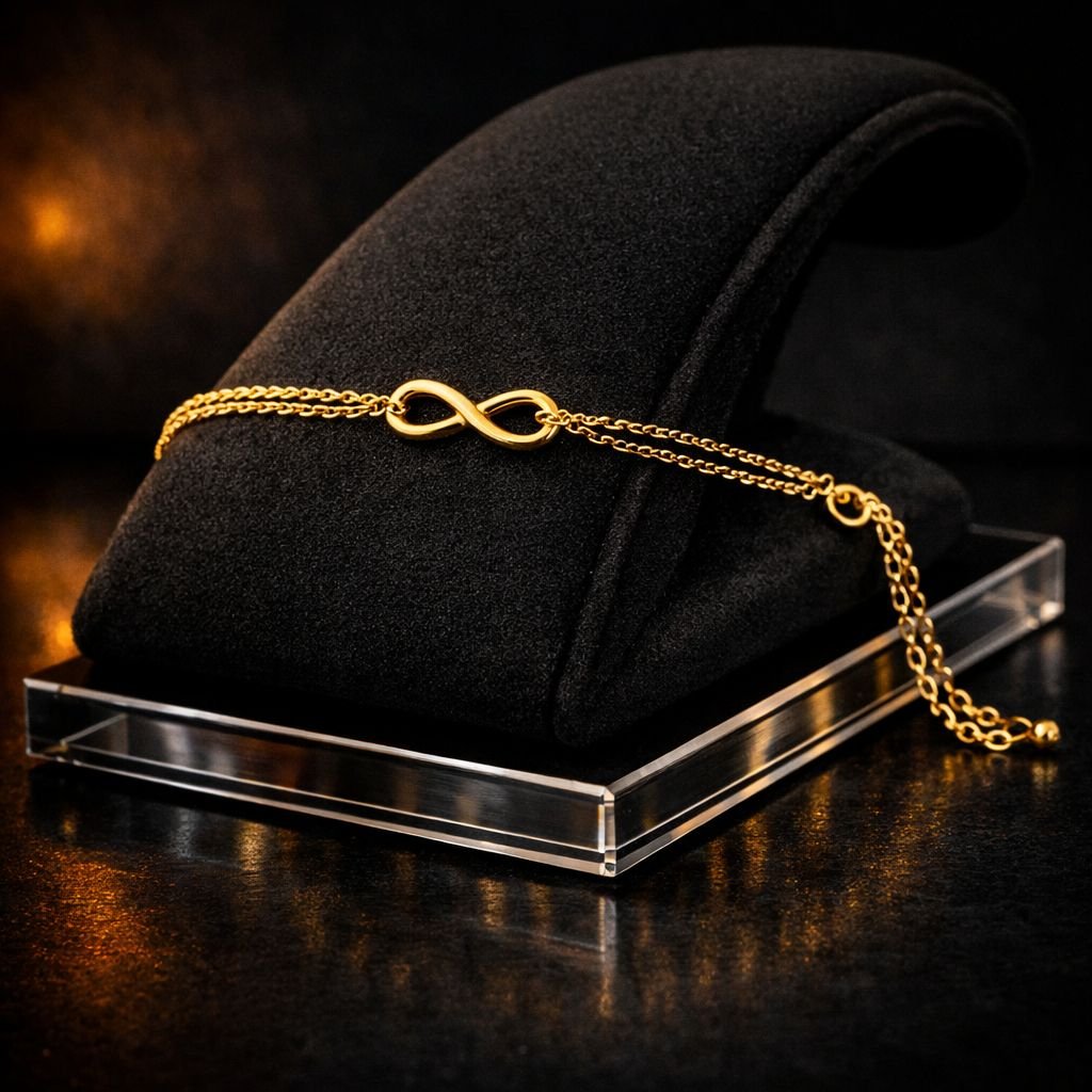 • The Eternal Infinity Bracelet features a refined gold infinity motif set on a sleek double-chain design. Minimal yet meaningful, this bracelet embodies continuity and grace—perfect for everyday wear or as a subtle statement of enduring style.