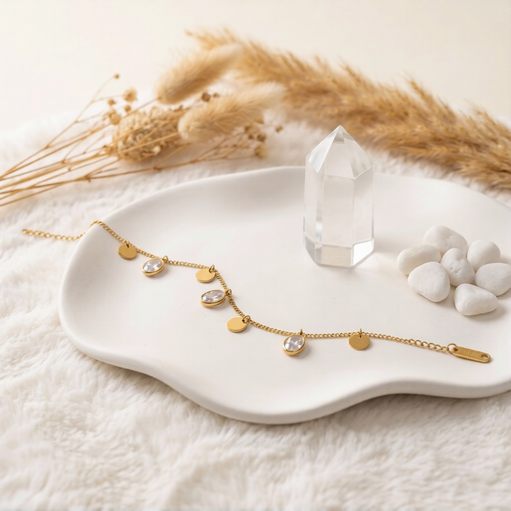 • Redefine your resort and summer wear with this exquisite Charm Drop Anklet. Tapping directly into the resurgence of nostalgic charm jewelry , this piece features a delicate yet durable golden chain adorned with alternating solid high-polish discs and brilliant, bezel-set clear stones. The fluid movement of the charms reflects a warm, rich glow with every step, perfectly capturing the highly desired "Golden Hour" aesthetic. Crafted from premium, skin-friendly materials to withstand the elements, it brings an immediate touch of luxury to a bare ankle or a strappy sandal.